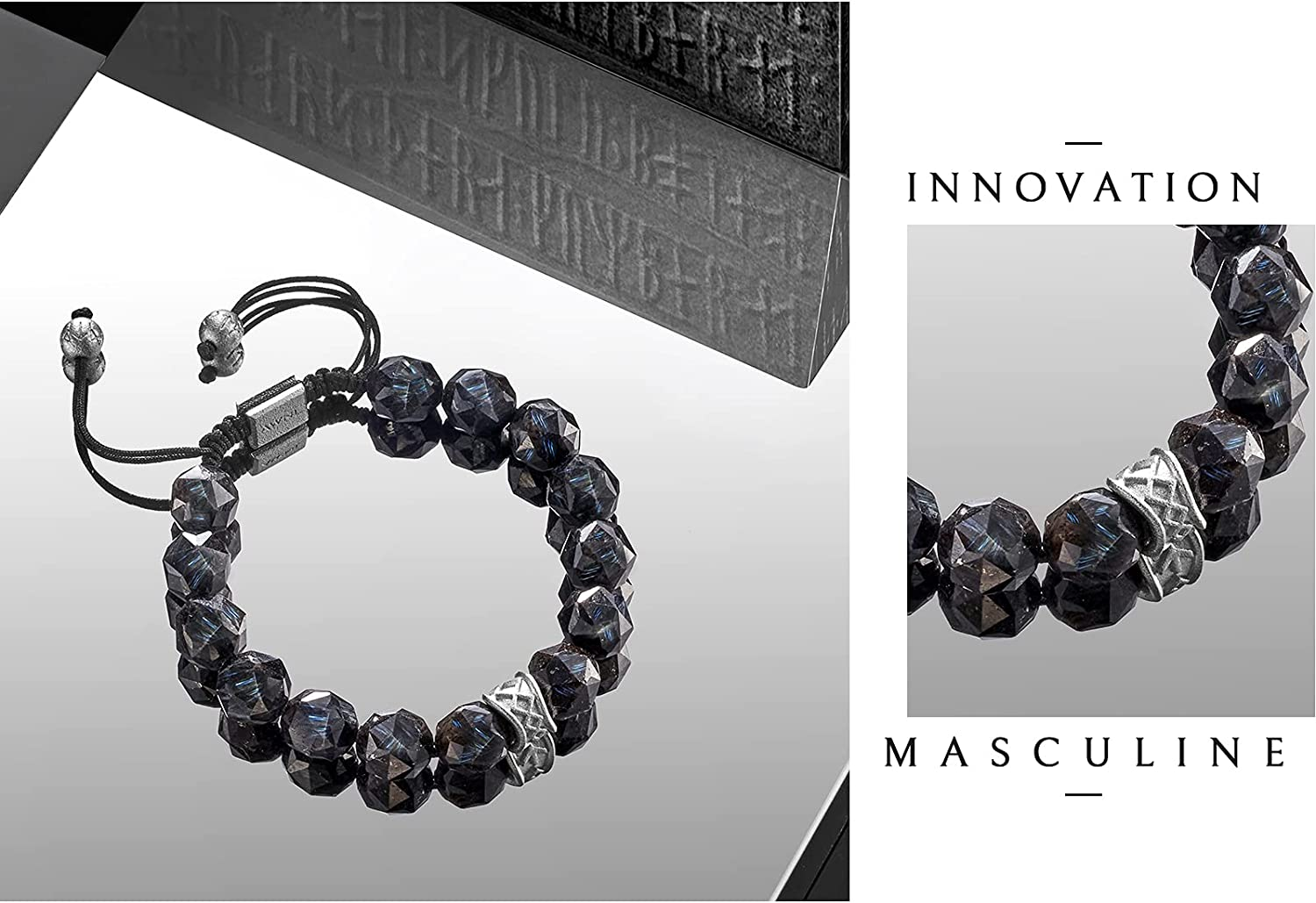 INSPIRATION - The Norse Magic Alphabet Rune represents blessing and protection Nuummite, a 3 billion year old protective crystal that is every magician's ultimate treasure. A clever combination of mystical power and modern design, this beaded bracelet turns into a walking amulet that provides significant protective power and healing energy.